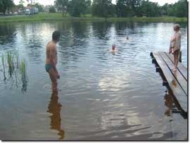 Direkt gegenüber lädt ein kleiner Badesee uns verschwitzte Radfahrer zur Abkühlung ein, welches wir auch direkt wahrnehmen. Vom See aus führt ein schmaler Bach in Richtung Nemunas, dessen Wasser so rein ist, dass wir in ihm sogar Teichmuscheln vorfinden. Nach dem Bad im See und der Begehung des Baches hat Aldona in der Zwischenzeit ein leckeres Abendessen gezaubert und auch zum Nachspülen ist in ihrem kleinen Laden genug zu bekommen. Ansonsten jedoch hat der Ort nicht viel - oder besser gesagt - gar nichts zu bieten, also geht es früh in die Betten, um ausgeruht den nächsten Tag anzugehen. |