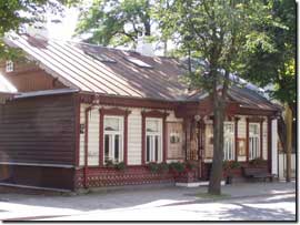 Messe besuchten. Kurz darauf machen wir uns auf, die Stadt zu erkunden. Kaunas liegt in herrlichstem Sonnenschein und da es Samstag ist, nutzen ihn wohl viele junge Paare, um in dieser schönen Stadt standesamtlich und in Weiß zu heiraten. Nie sahen wir so viele Hochzeitsgesellschaften an einem Tag wie hier in Kaunas. Und noch nie sahen wir so fröhliche Gruppen direkt vor dem Standesamt, dem so genannten weißen Schwan: da wird getanzt, Musik gespielt, kleine Reden gehalten, fotografiert und viel gelacht. In der Stadt (ca. 450000 Einwohner) herrscht ein buntes Treiben. Die Straßencafés haben Hochkonjunktur, Hare-Krischna-Jünger ziehen singend durch die City, überall an den Ecken trifft man Straßenhändler, die zumeist ihre landwirtschaftlichen Produkte feilbieten. Die Geschäfte brauchen unseren westlichen Standard nicht zu scheuen. Es gibt nichts, was es nicht gibt, und dieses ist in den meisten Fällen wesentlich günstiger als bei uns in Deutschland In einem Antik-Laden direkt am Marktplatz entdeckt Leon eine sehr interessante Ikone, und ist alsbald in ein Verkaufsgespräch mit dem Inhaber verwickelt. Da er gehört hatte, dass man durchaus mit den Geschäftsleuten handeln könne, versucht er den Preis zu drücken. Das gelingt ihm auch, allerdings scheint ihm das Entgegenkommen des Verkäufers nicht genug zu sein und er versucht, noch mehr herauszuholen. Dieses Unterfangen geht allerdings nach hinten los, denn damit hat er wohl die Ehre des Händlers gekränkt, und fortan ist dieser nicht mehr bereit, ihm überhaupt eine Ikone zu verkaufen. Uns tut es insofern leid, als dass Leon am Tag darauf Geburtstag hat, und so beschließen wir, den Laden zunächst zu verlassen, und es später noch einmal zu versuchen, ohne dass Leon es mitbekäme. Doch als wir gut eine Stunde später noch einmal einen Versuch wagen, ist das Geschäft geschlossen. Pech gehabt, Leon. Wir lassen uns ein Restaurant empfehlen, wo man typisch litauisch essen gehen kann. Ein junger Mann verweist uns auf ein sehr altes Restaurant und legt uns ans Herz, Cepelinai zu bestellen, und als Getränk sollte es schon gira sein. Im BERNELIU UEIGA im Stadtzentrum in der K. Donelaicio g. 11 erleben wir ein fantastisches Restaurant, wo wir diese Spezialitäten serviert bekommen. Die Cepelinai (mit Fleisch gefüllte Kartoffelklöße mit einer speziellen Soße) schmecken fantastisch und gira ist so wunderbar erfrischend, dass wir beschließen, dieses in Zukunft nur noch zu trinken. Leider haben wir es in dieser Qualität woanders nicht mehr finden können. |